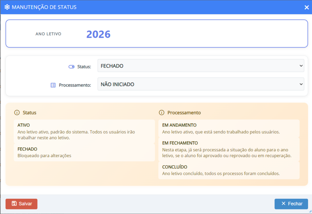Ao clicar na opção MANUTENÇÃO, será exibido a tela para editar o status e a situação do ano letivo.