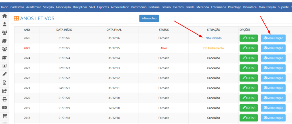 Será exibido a lista do anos letivos, para ativar o ano desejado, basta clicar no botão MANUTENÇÃO que está na linha do ano letivo desejado.