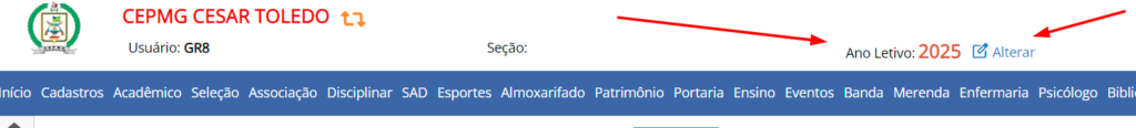 Para alterar o ano letivo, basta clicar no botão ao lado do ano letivo