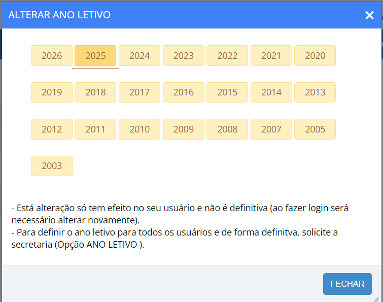 Nesta opção o usuário pode alterar o seu ano letivo, mas ao fazer o login novamente volta para o ano letivo padrão selecionado pela secretaria.