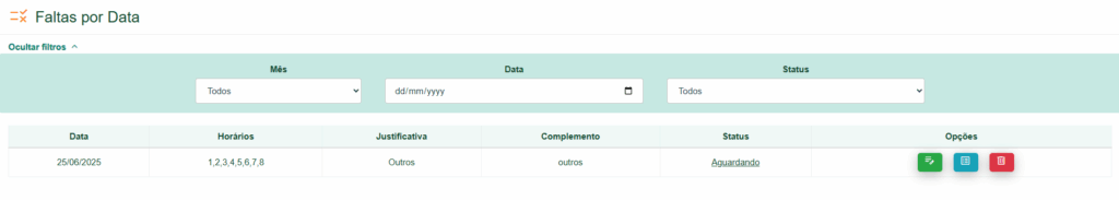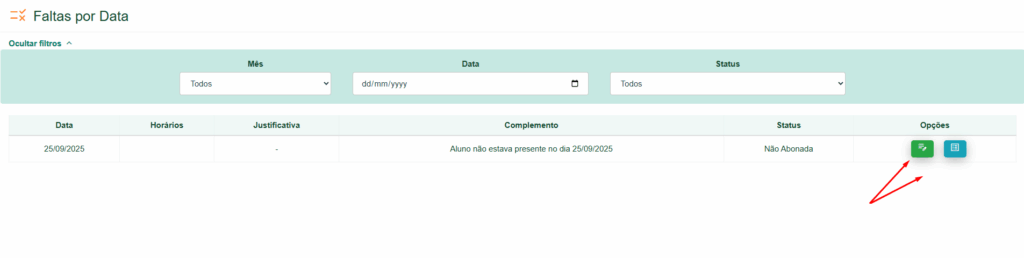 Ao abrir será listada as suas faltas com duas opções: