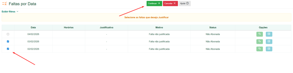 Selecione as faltas a serem justificadas